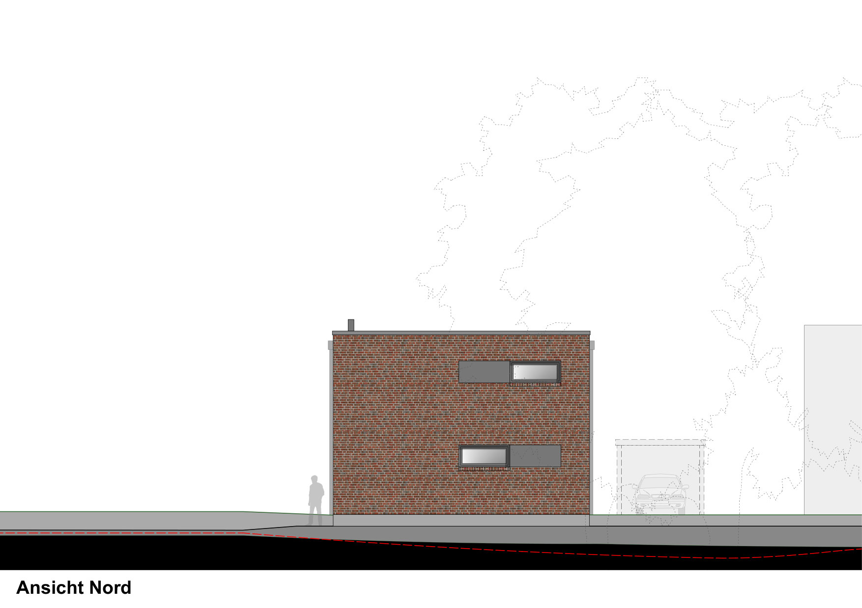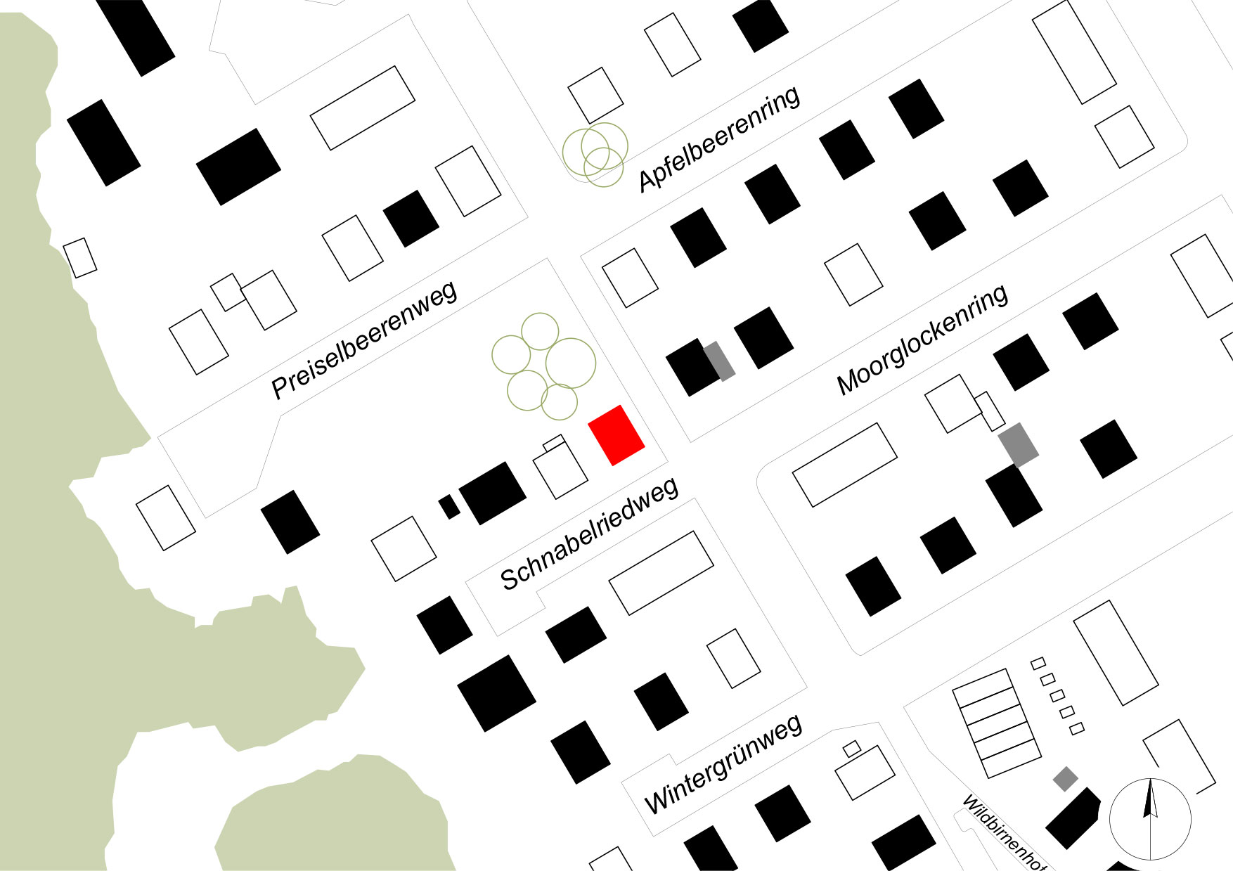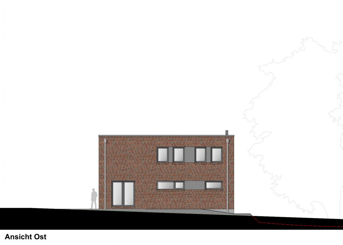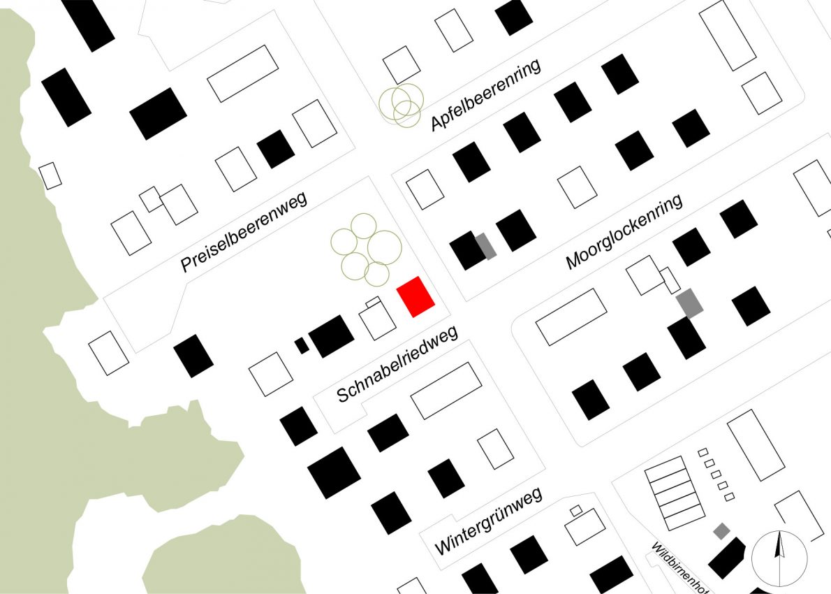 Das kleine Gebäude wurde daher etwas nach Süden versetzt, um Bäumen und Haus mehr Raum geben zu können.