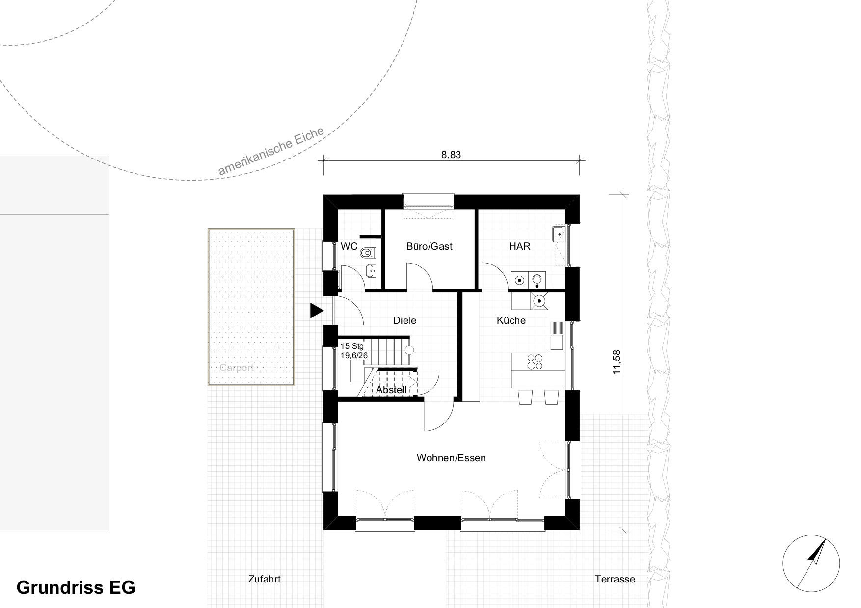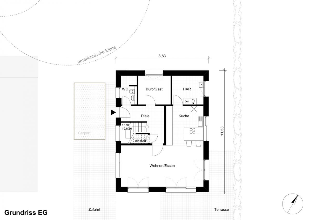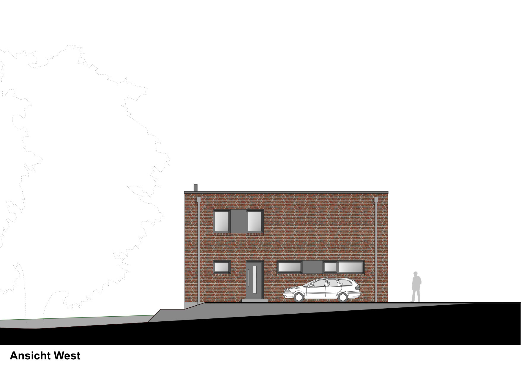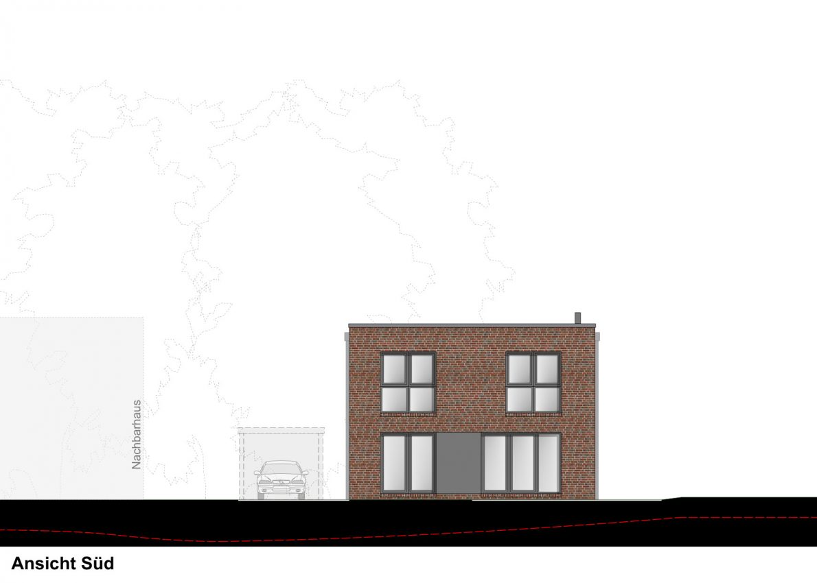 Das kleine Gebäude wurde daher etwas nach Süden versetzt, um Bäumen und Haus mehr Raum geben zu können.